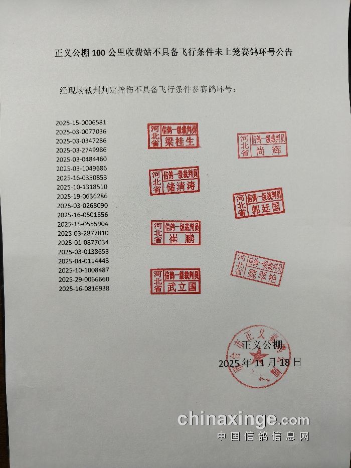 正义公棚100公里收费站不具备飞行条件未上笼赛鸽环号公告