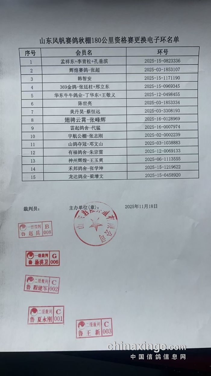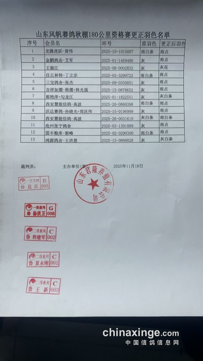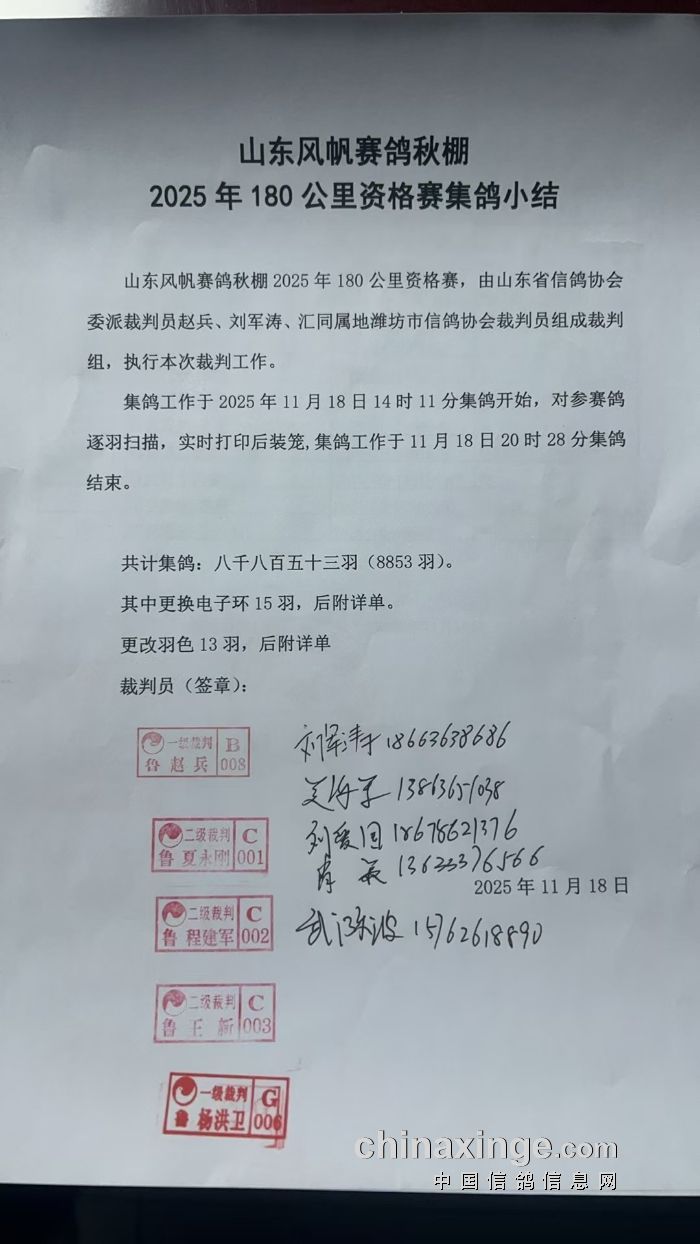 山东风帆赛鸽公棚(秋棚)2025年第二届获奖鸽照片