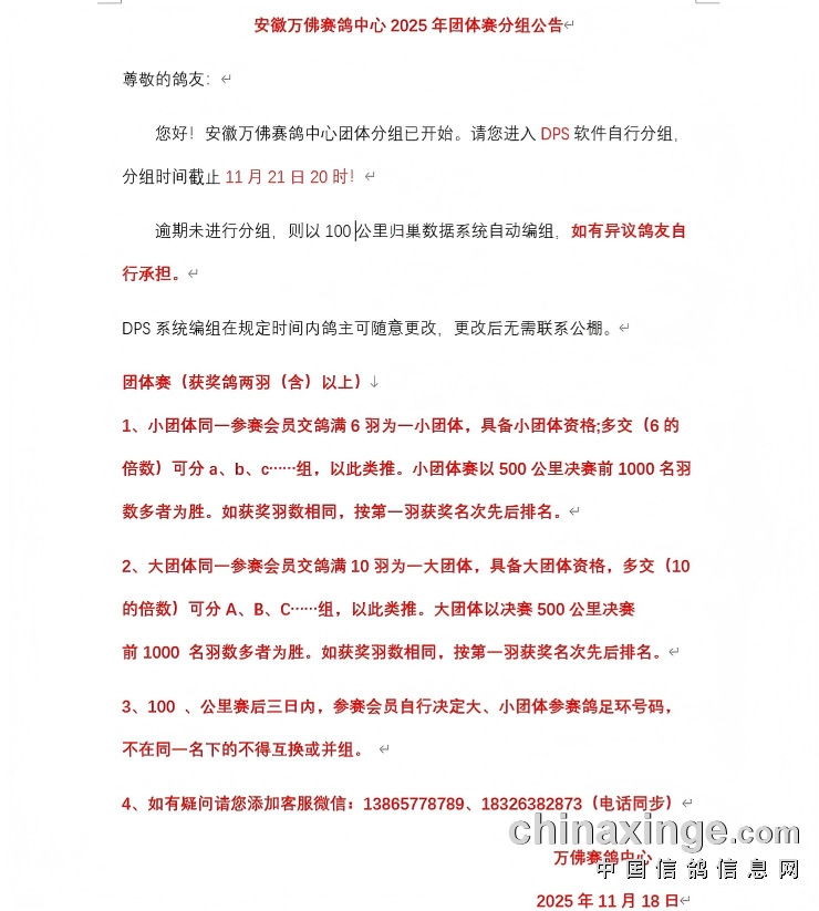 安徽万佛赛鸽中心2025年团体赛分组公告
