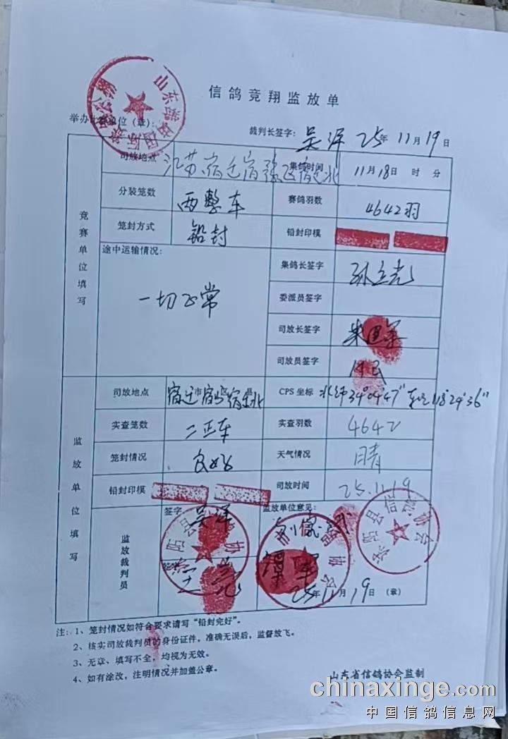 山东潍坊国际赛鸽公棚280公里预赛于2025年11月19日早7点17分在江苏宿迁市宿迁北开笼。