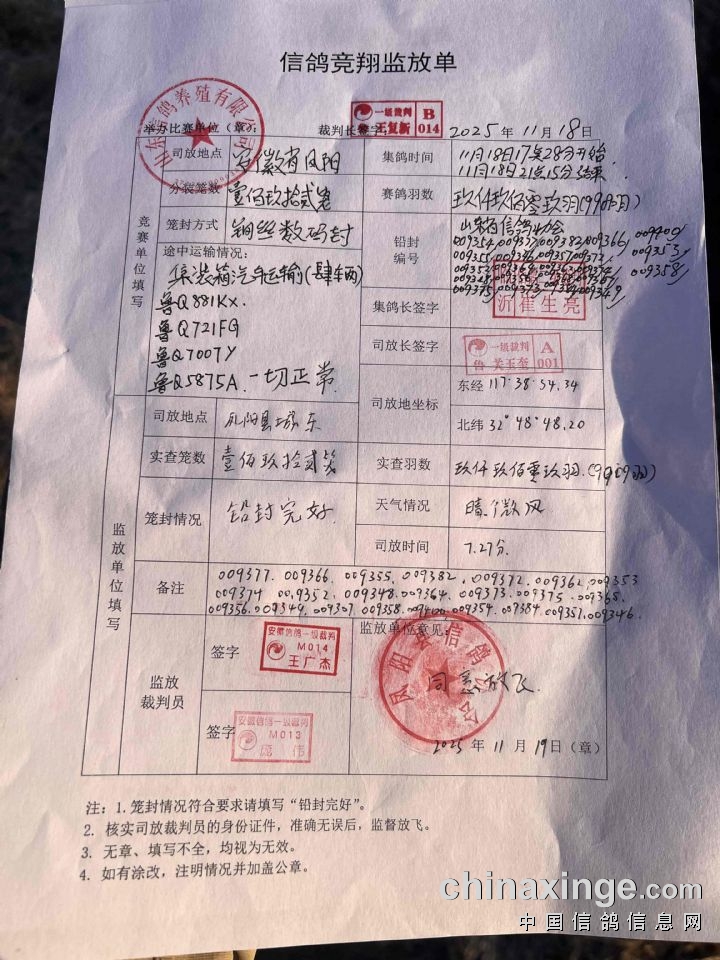 山东胜道公棚2025年第十四届赛事第一关比赛于11月19日7点27分在安徽凤阳开笼,集鸽羽数9909羽,司放地天气晴,赛鸽定向良好!祝君好运!
