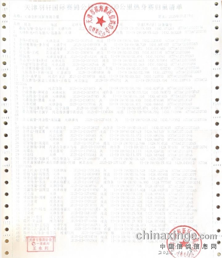 天津羽轩赛鸽公棚(热身赛)前50名获奖名单