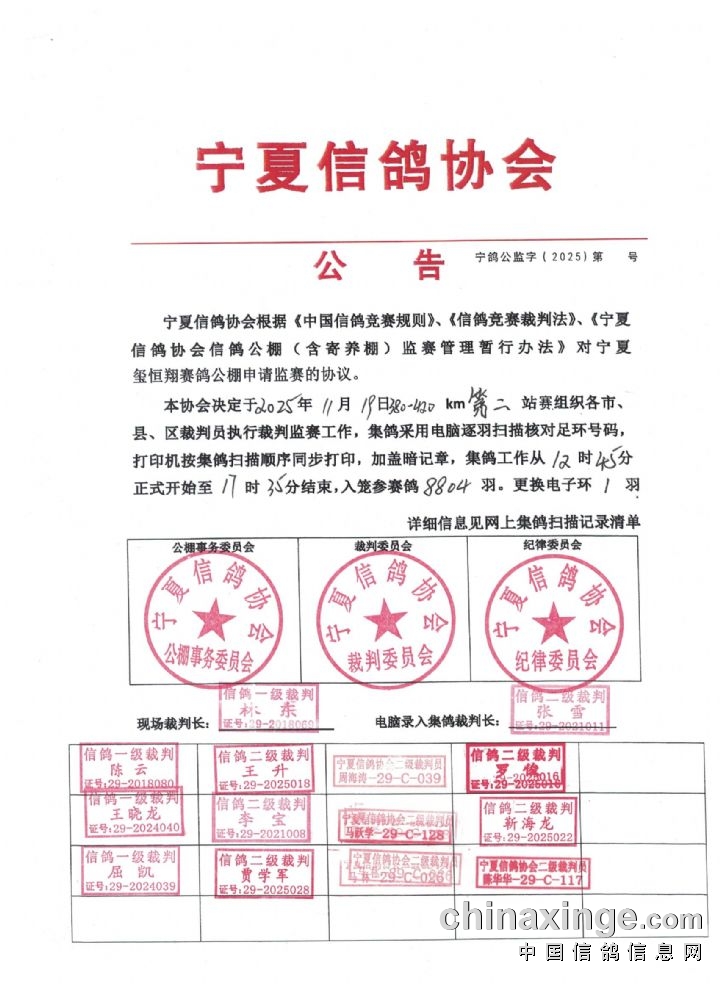 • 宁夏信鸽协会公告 (2025-11-20 17:46:20)
