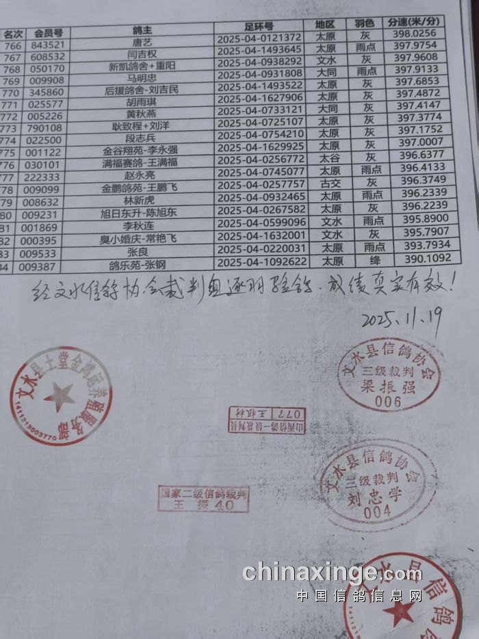 • 山西金鸿运公棚三关鸽王获奖明细(两日内无异议,自动生效) (2025-11-19 17:46:41)