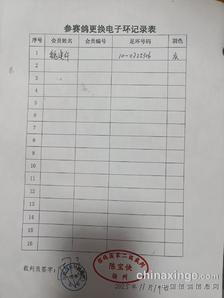 江苏弘腾赛鸽公棚:热身赛电子环更换名单