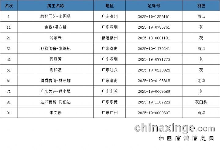 • 广东海翔(秋棚)第三关(370公里)单羽常规赛获奖名单(名单公示2天,无异议即发放奖金) (2025-11-15 14:24:54)