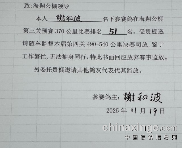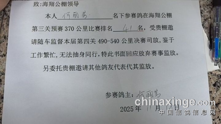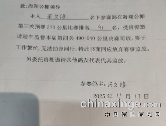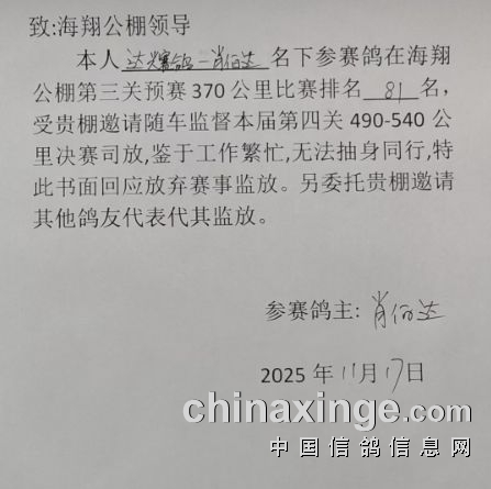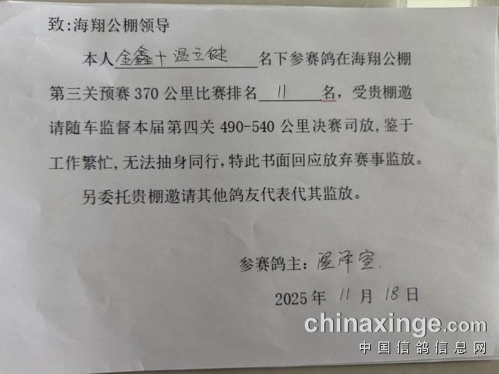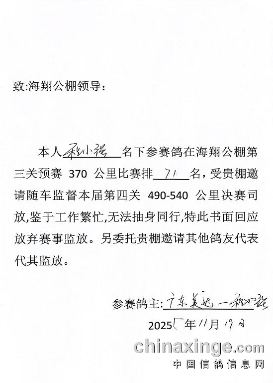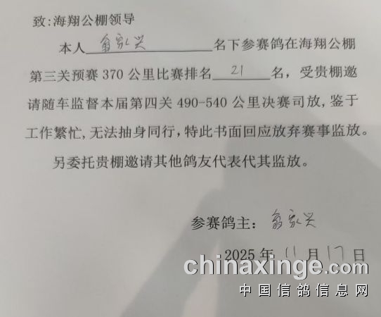 2025年广东海翔(秋棚)第九届第四关490-540公里决赛定于1121日9点开始集鸽11月22日早上开笼。决司放地点:福建福清,空距约:500公里;届时由广东省鸽协委派裁判长、周边裁判组及汕尾市裁判组进行逐羽扫描、核对环号、盖章、监放等工作
