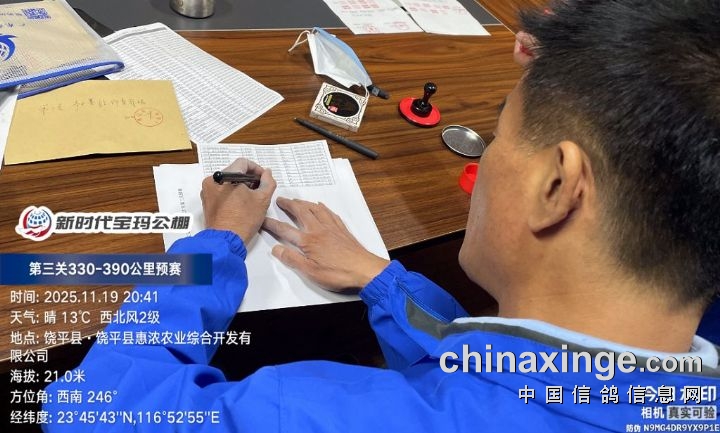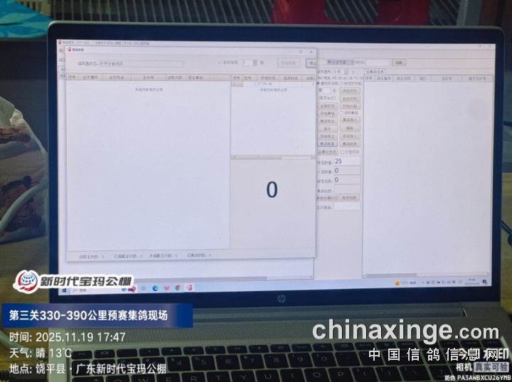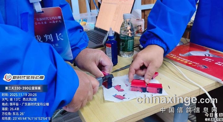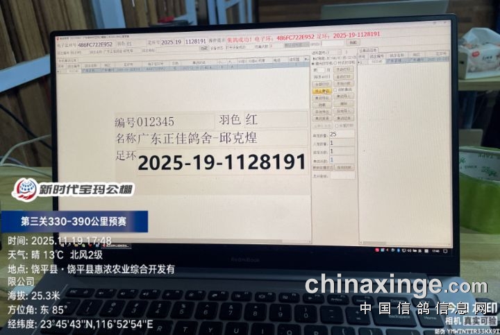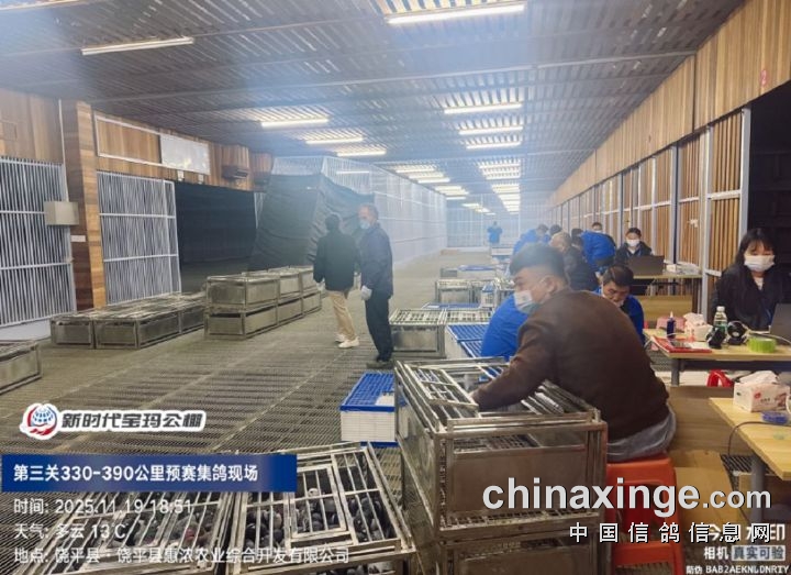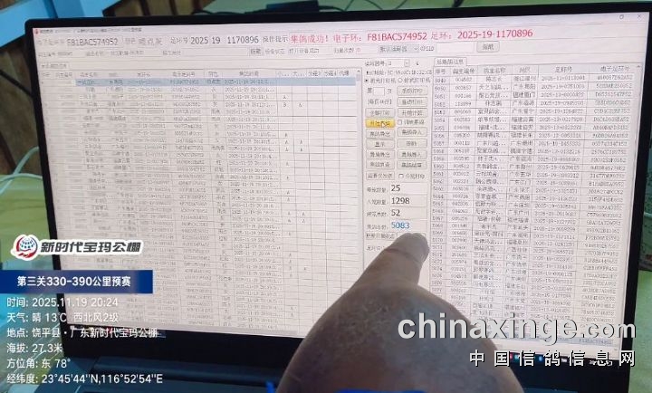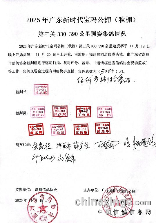 2025年广东新时代宝玛(秋棚)第三关330-390公里预赛,由广东省潮州市信鸽协会裁判组进行逐羽扫描、核对环号、盖章等工作;共集鸽5083羽。