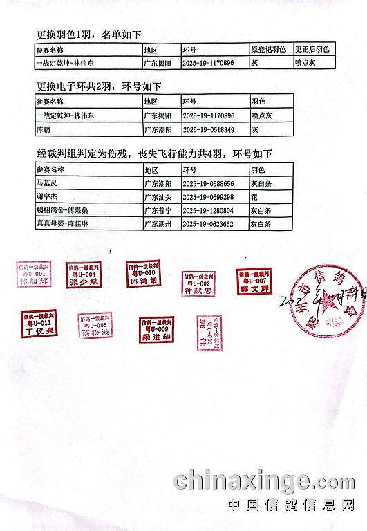 经裁判组判定为伤残,丧失飞行能力共4羽,环号如下