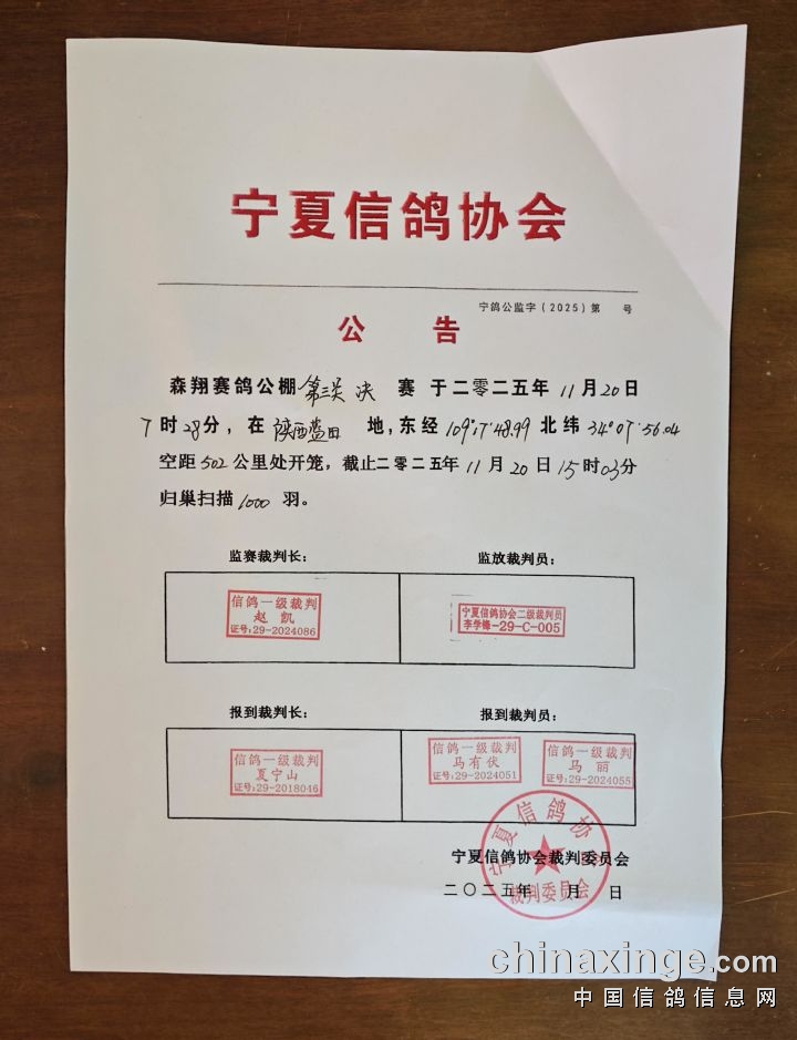 • 宁夏信鸽协会公告 (2025-11-27 14:21:19)