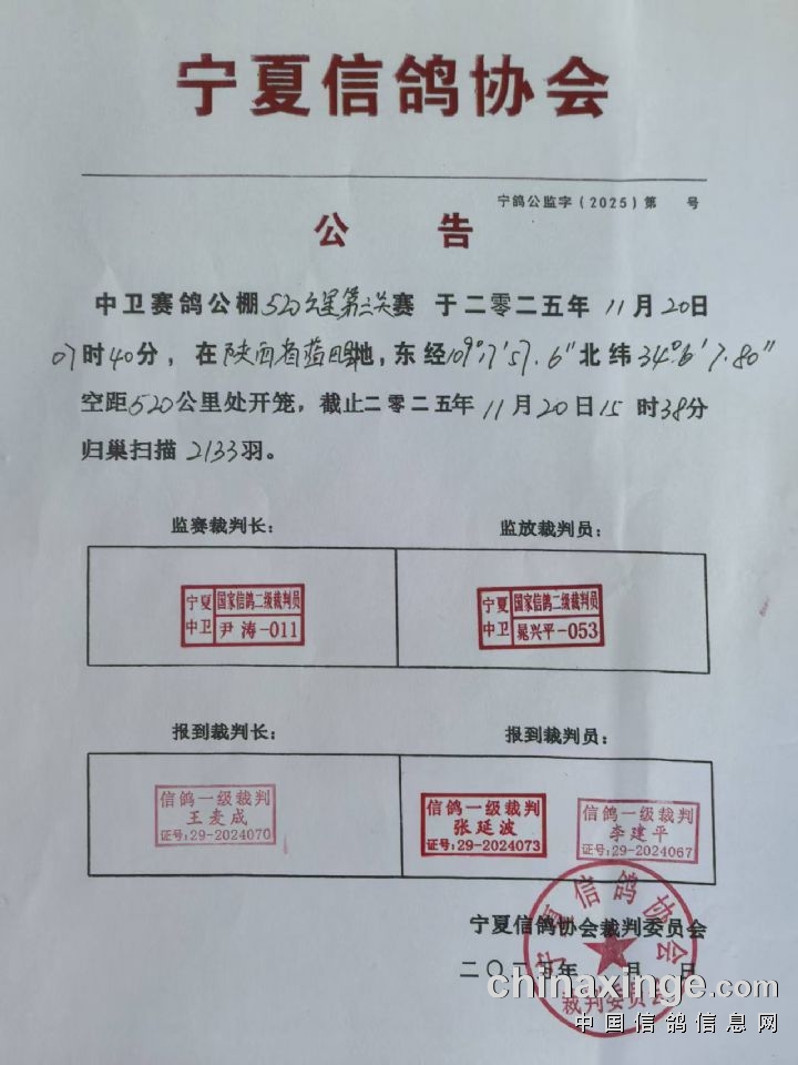 • 宁夏中卫赛鸽公棚520公里第三关奖金领取通知 (2025-11-20 17:10:31)