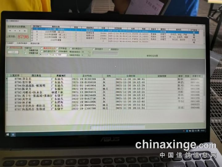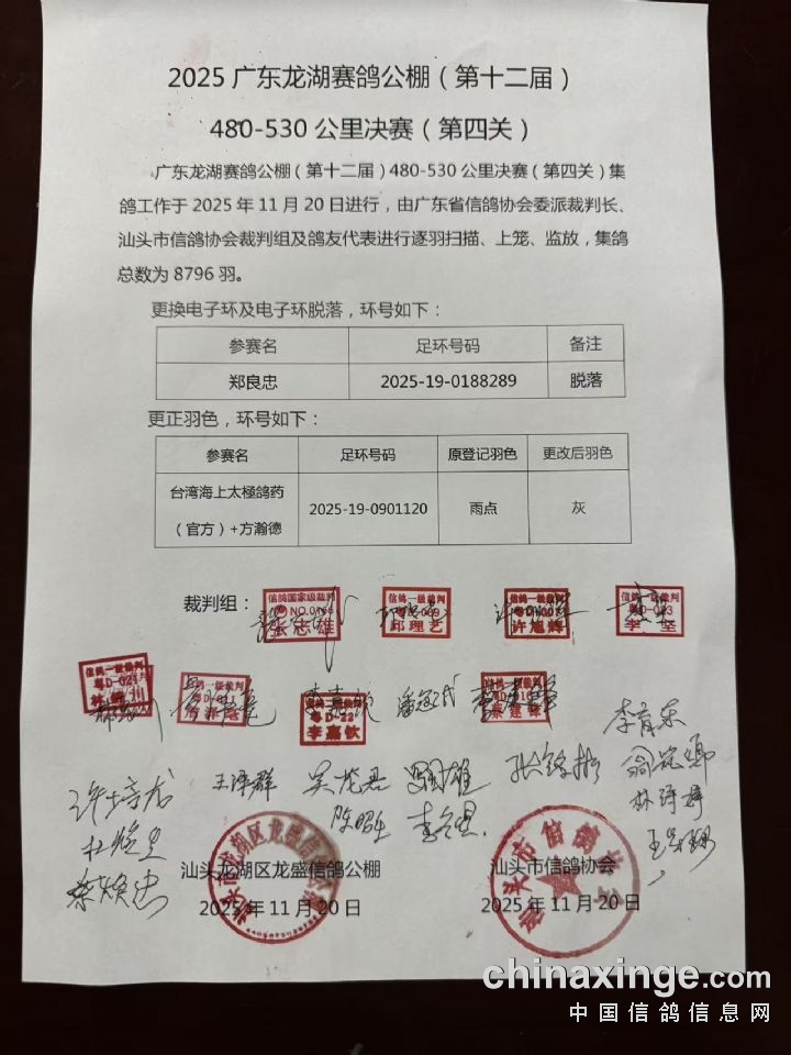 广东龙湖赛鸽公棚(第十二届)480-530公里决赛(第四关)集鸽工作于2025年11月20日进行,由广东省信鸽协会委派裁判长、汕头市信鸽协会裁判组及鸽友代表进行逐羽扫描、上笼、监放,集鸽总数为8796羽。