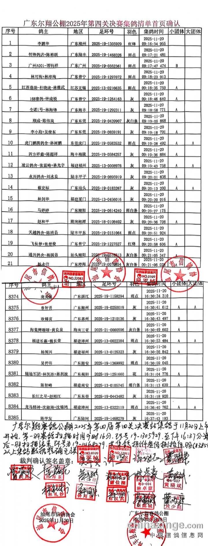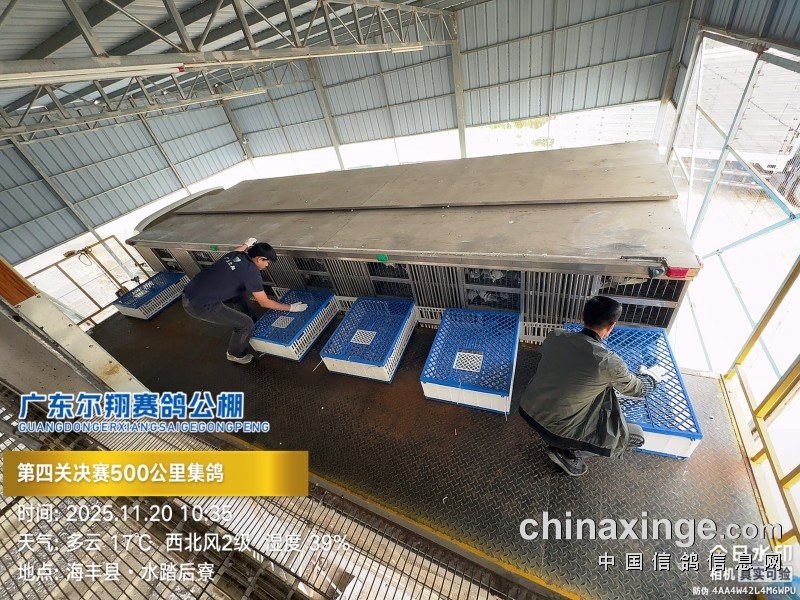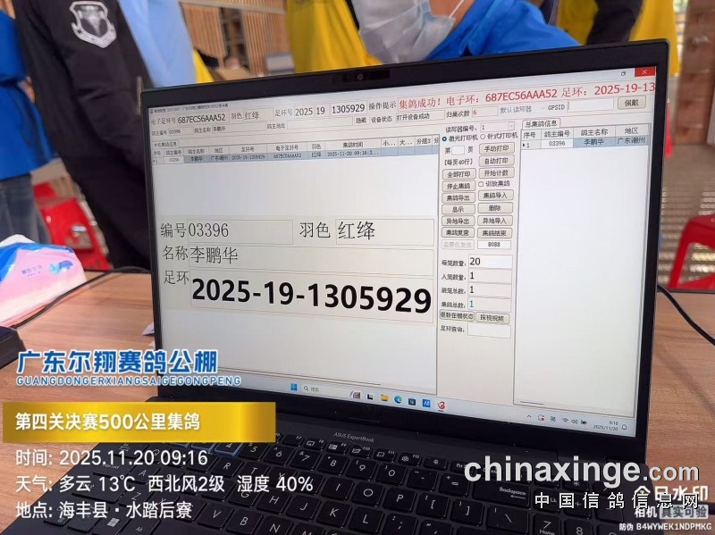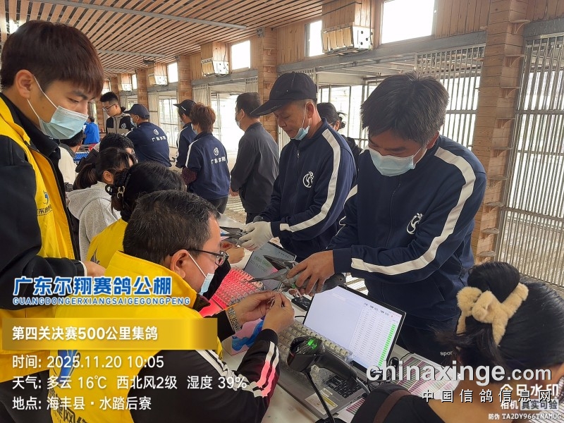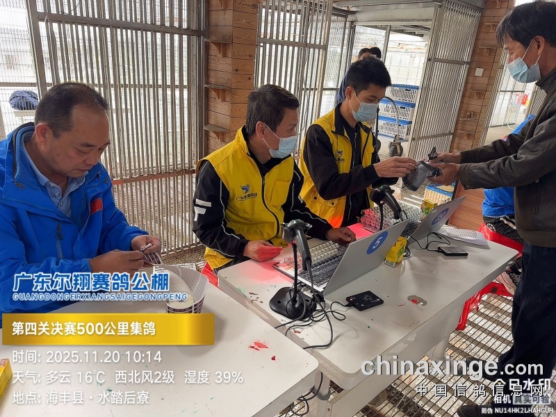 2025年广东尔翔(秋棚)第四届第四关决赛,由广东省鸽协委派裁判长及汕尾市裁判组进行逐羽扫描、核对环号、盖章等工作;共集鸽 8385 羽。