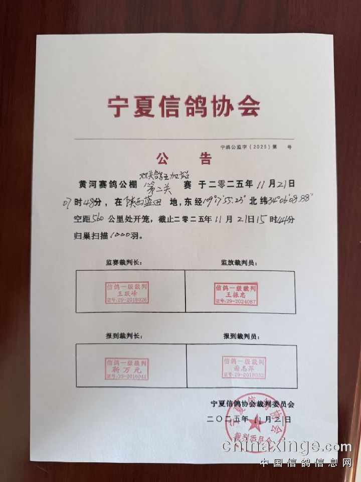宁夏黄河赛鸽公棚双关鸽王加关赛第二关奖金领取通知
