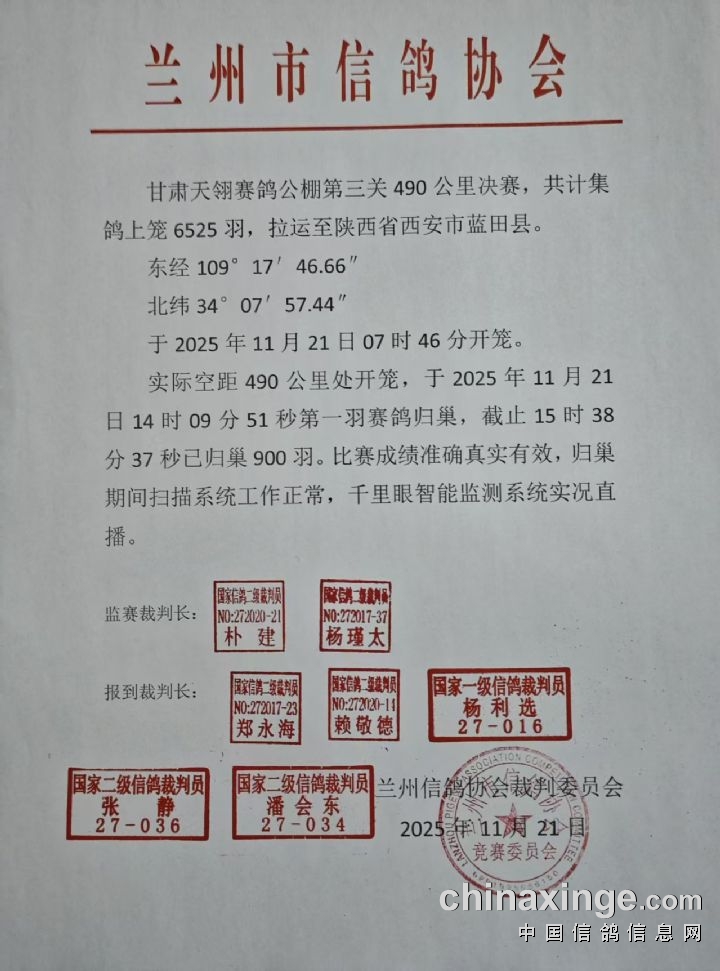 甘肃天翎赛鸽公棚490公里决赛1-900名获奖明细
