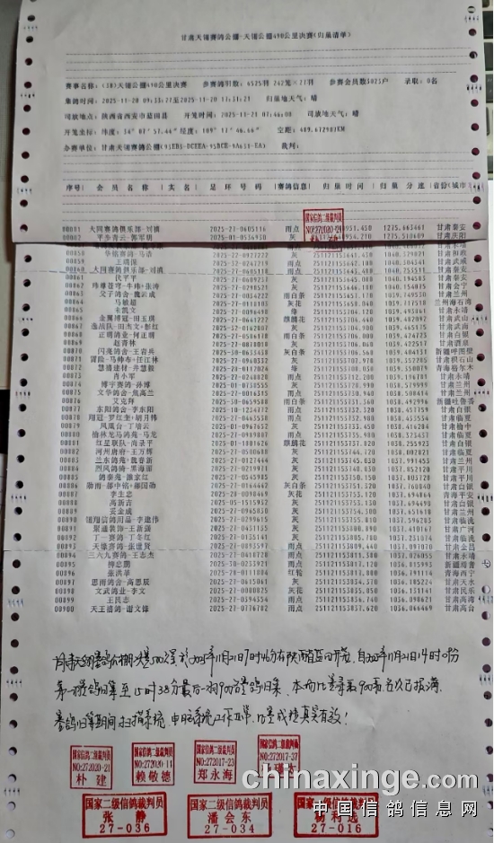 甘肃天翎赛鸽公棚490公里决赛集鸽数据(按时间)