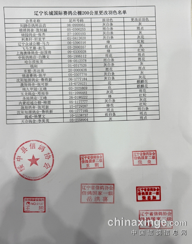 辽宁长城国际赛鸽公棚200公里资格赛更改羽色名单
