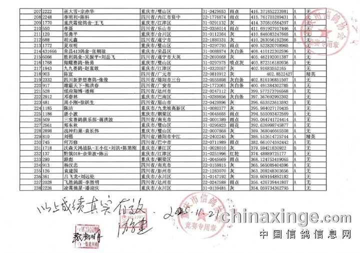 重庆翔标公棚首届秋赛决赛成绩报告