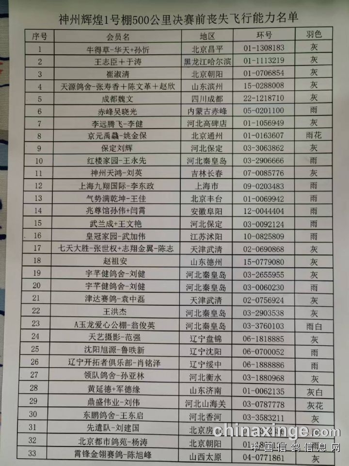 神州辉煌1号棚500公里决赛前丧失飞行能力名单
