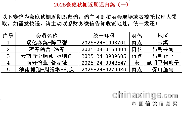 • 东川豪庭秋棚“决赛501-800名+落榜没加站+加站落榜鸽”退回公告 (2025-11-16 10:57:53)