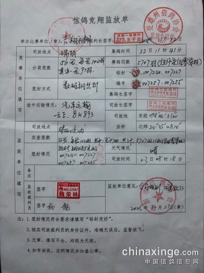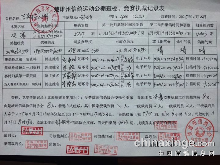 楚雄吉翔秋棚400公里决赛执裁记录表、监放单