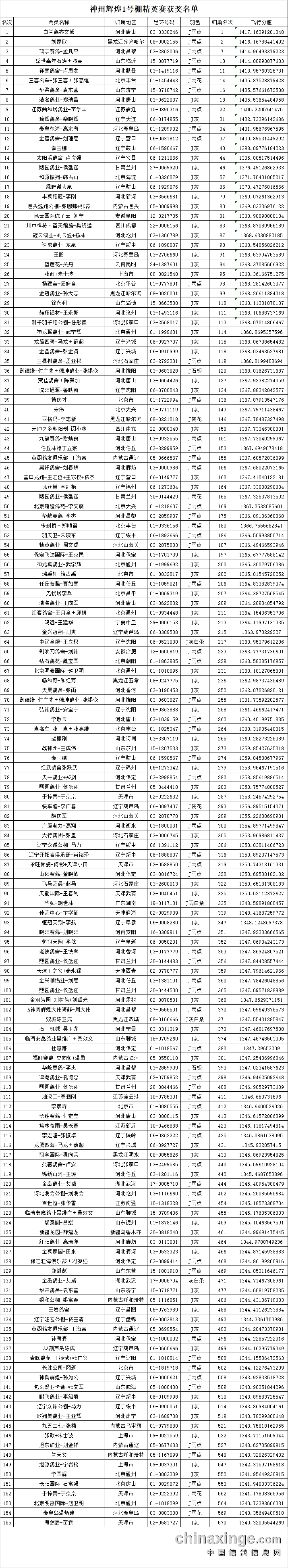 神州辉煌1号棚加站赛集鸽数据