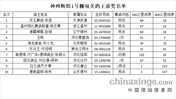 神州辉煌1号棚500公里决赛归巢后丧失飞行能力名单