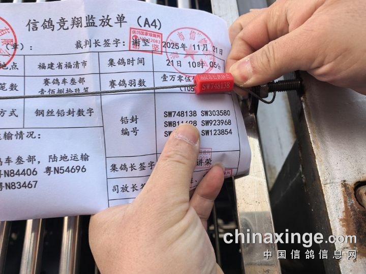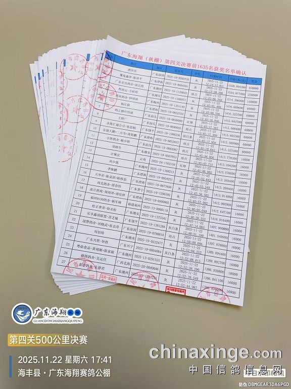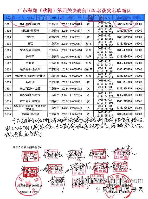 裁判对前1635名获奖鸽名单签字盖章确认