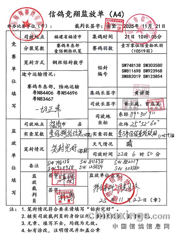 • 广东海翔(秋棚)双关鸽王挑战赛第一关(530-550公里)单羽常规赛规程 (2025-11-24 13:56:14)