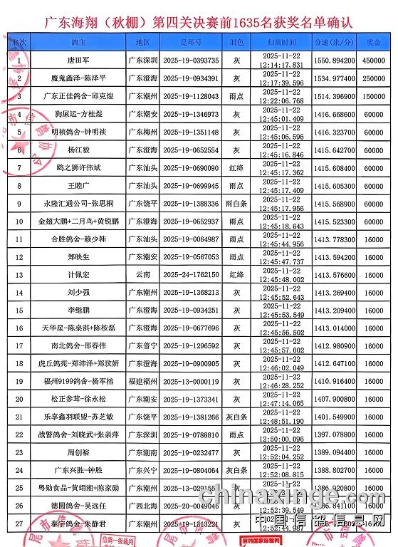 • 广东海翔(秋棚)第四关决赛各赛事获奖名单速览、及获奖会员领奖账户登记通道 (2025-11-23 22:22:30)