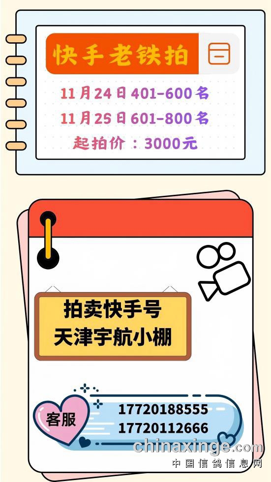 本次拍卖401至800名获奖鸽均在快手老铁拍进行拍卖