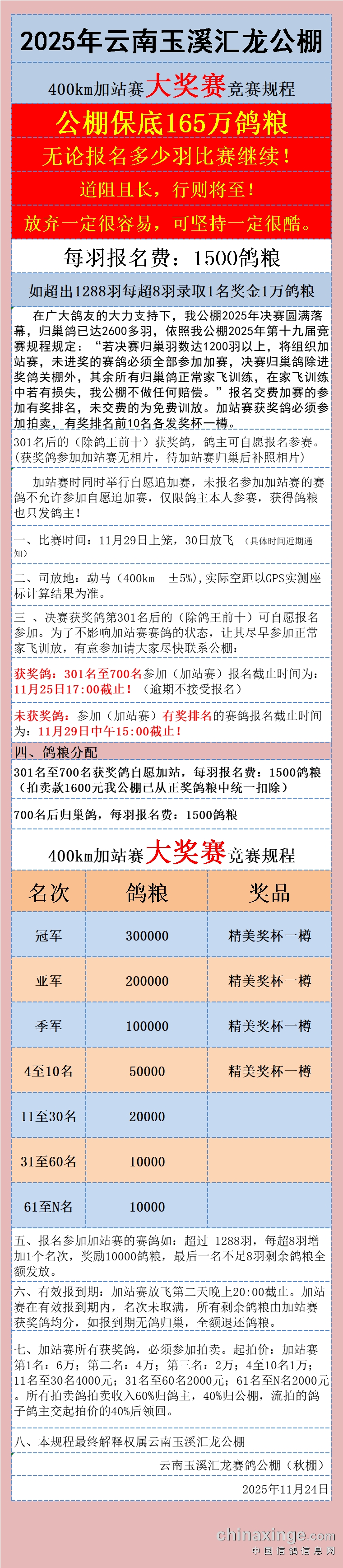 • 汇龙秋棚:鸽粮领取通知 (2025-11-25 3:17:43)