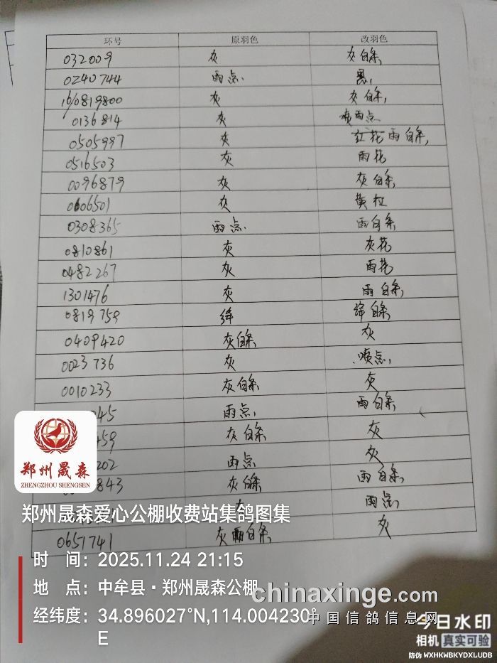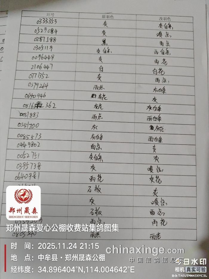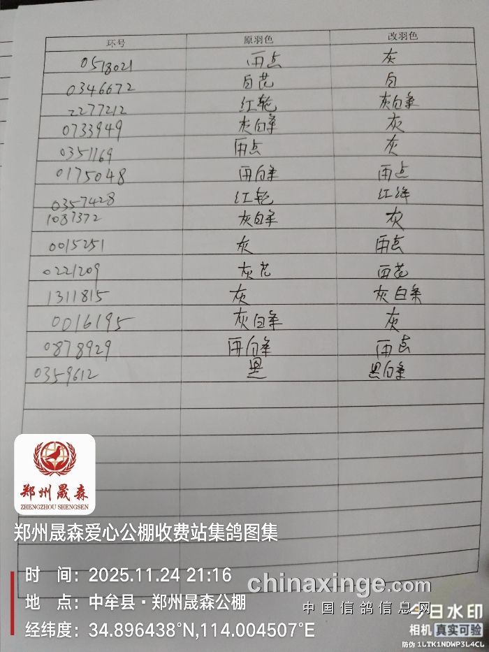 郑州晟森爱心公棚180公里热身赛集鸽数据(按顺序)