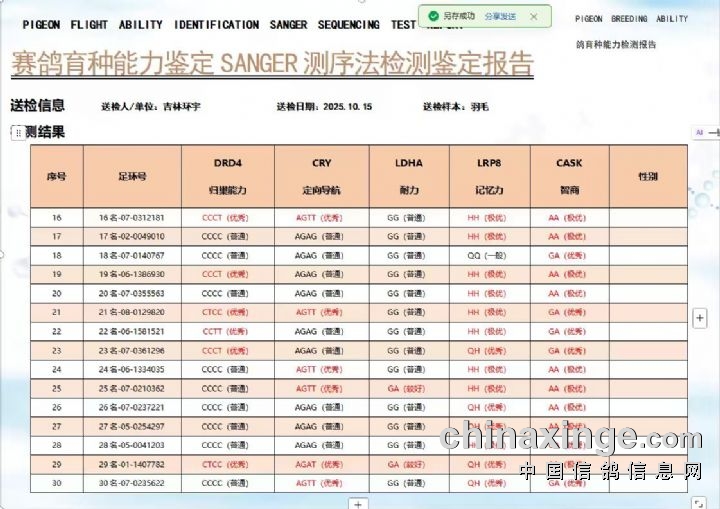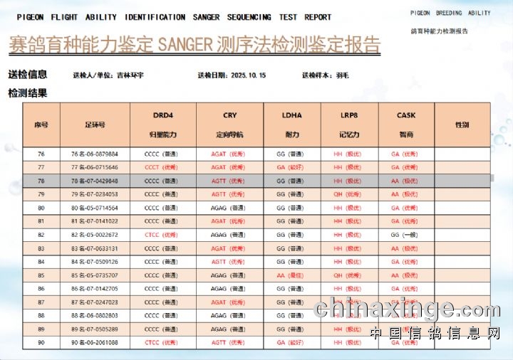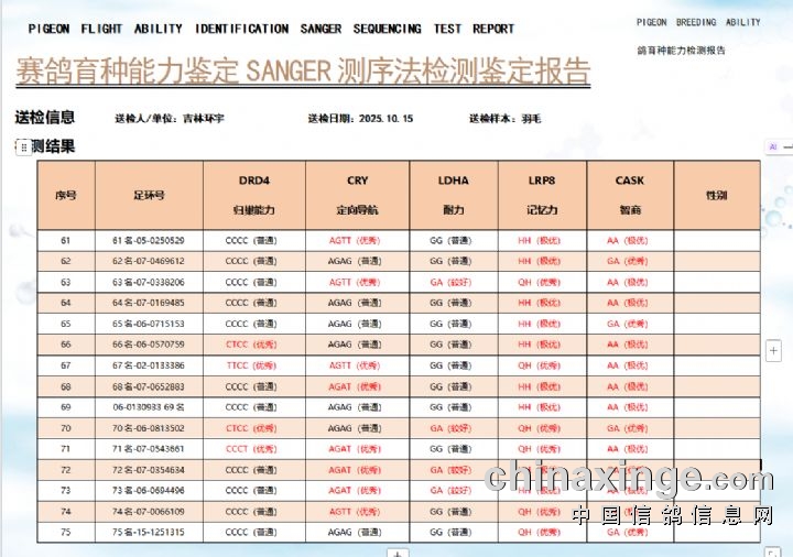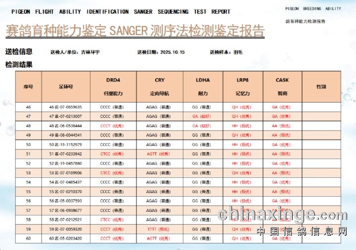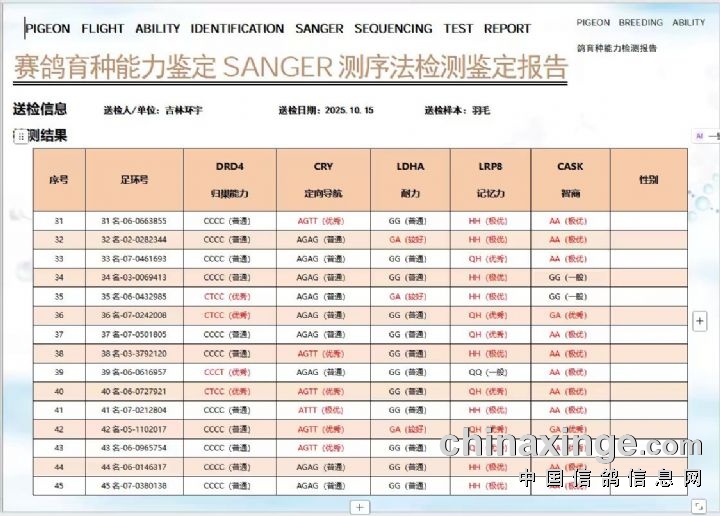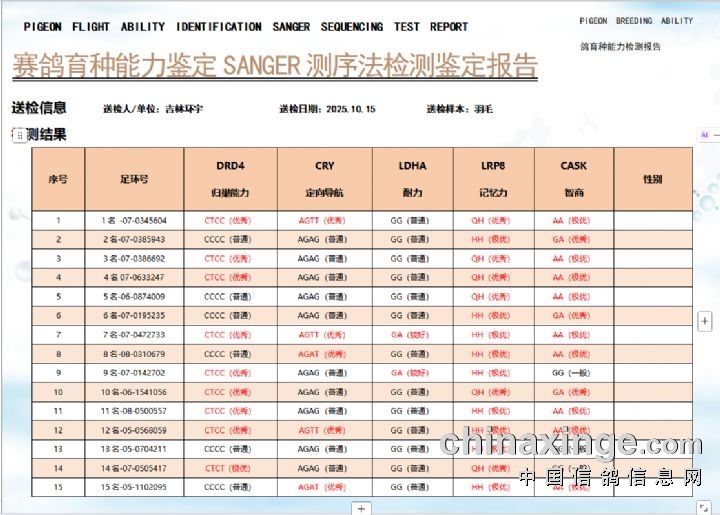 环宇(小)2025年三关鸽王前100名DNA数据分析报告