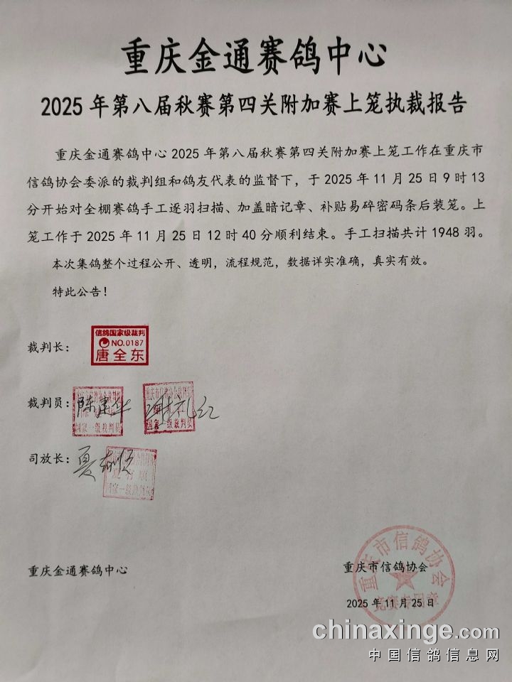 • 重庆金通2025年秋赛第四关附加赛开笼通知 (2025-11-26 8:30:37)
