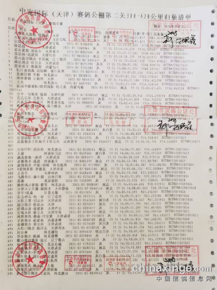 中宠国际(天津)赛鸽公棚第二关1-500名打印封存联