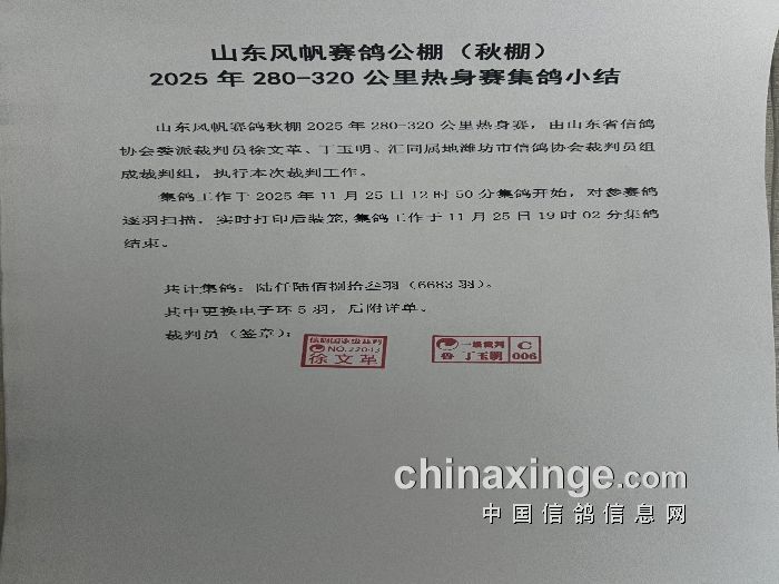 山东风帆赛鸽公棚(秋棚)280-320公里热身赛集鸽小结