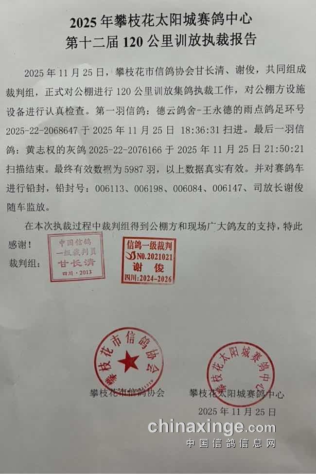 • 攀枝花太阳城赛鸽中心120公里分组公告 (2025-11-27 12:16:48)