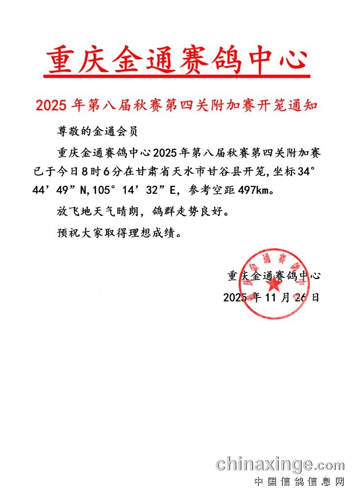 重庆金通2025年秋赛第四关附加赛开笼通知