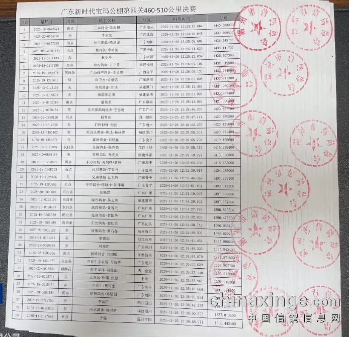 • 广东新时代宝玛(秋棚)第四关单羽四关赛获奖名单(名单公示2天,无异议即发放奖金) (2025-11-27 21:51:14)