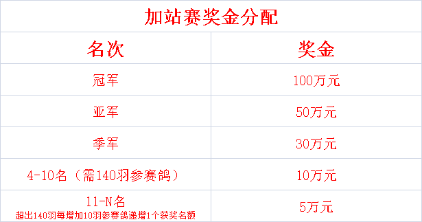 1、加站赛参赛费每羽5000元。公棚赞助180万。参加单羽赛必须参加加站赛。
