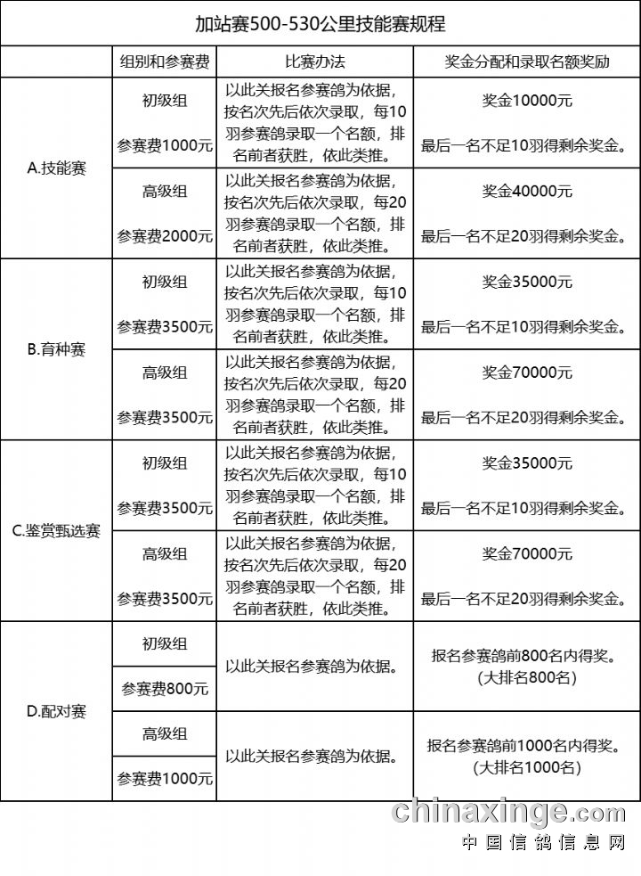 1、参赛费每羽1000元。公棚不提取任何费用。报名超出1860羽,每增加10羽奖励一个名额10000元。按照实际报名羽数递增或递减名次,最后一名按剩余羽数100%设奖。