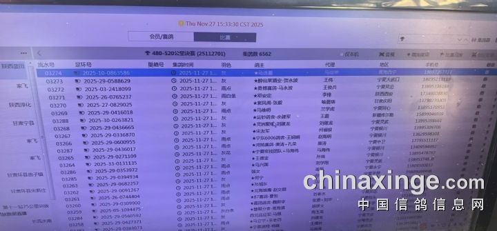 • 宁夏玺恒翔公棚480-520公里集鸽明细(按会员) (2025-11-27 15:46:58)