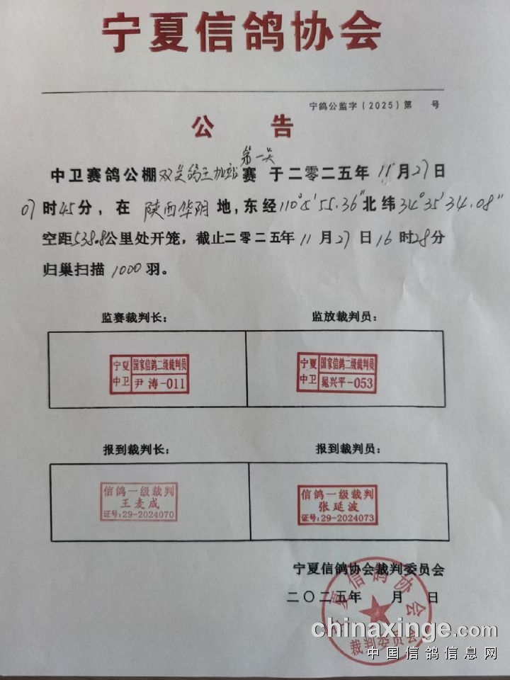 宁夏中卫赛鸽公棚双关鸽王加站赛奖金领取通知