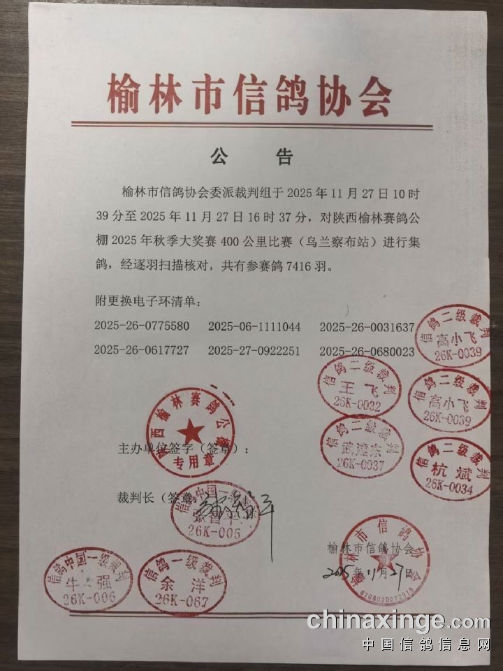 • 陕西榆林赛鸽公棚400公里比赛公告 (2025-11-24 10:27:20)