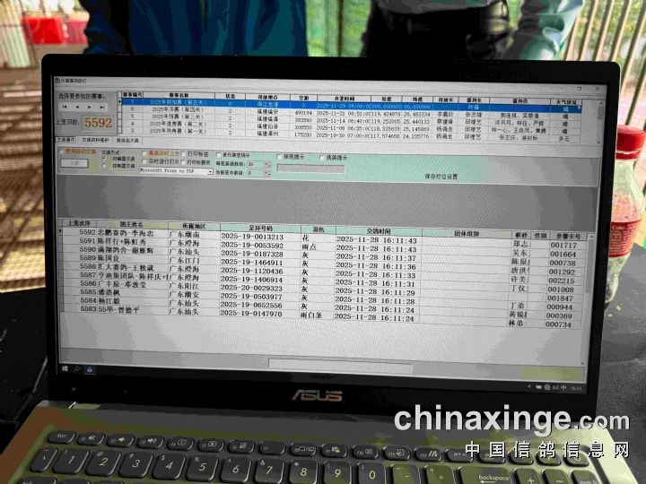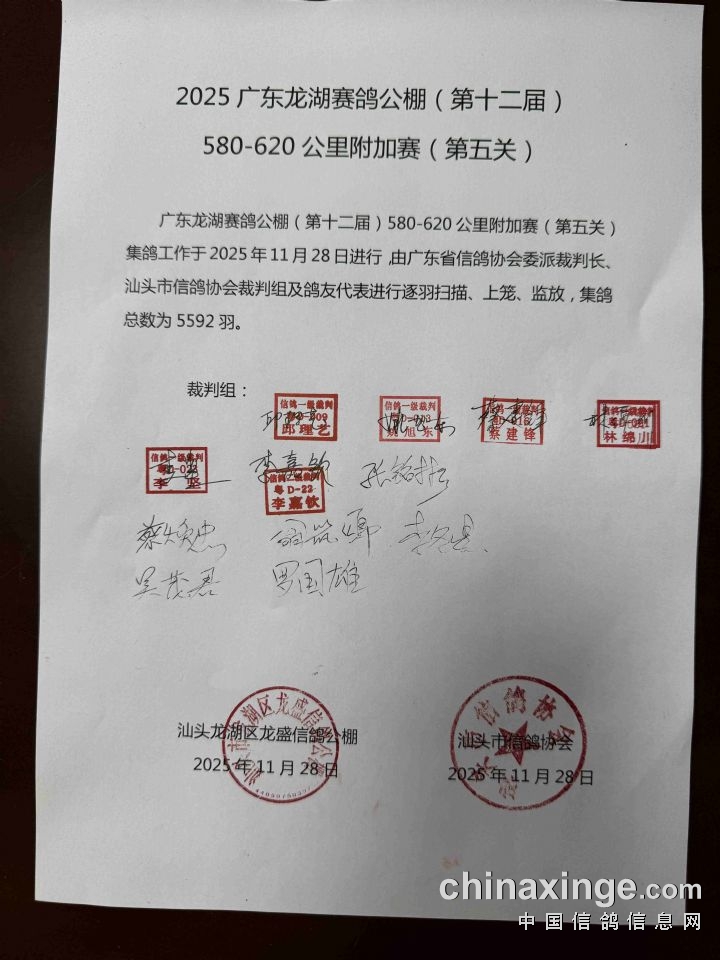 广东龙湖赛鸽公棚(第十二届)580-620公里附加赛(第五关)集鸽工作于2025年11月28日进行,由广东省信鸽协会委派裁判长、汕头市信鸽协会裁判组及鸽友代表进行逐羽扫描、上笼、监放,集鸽总数为5592羽。