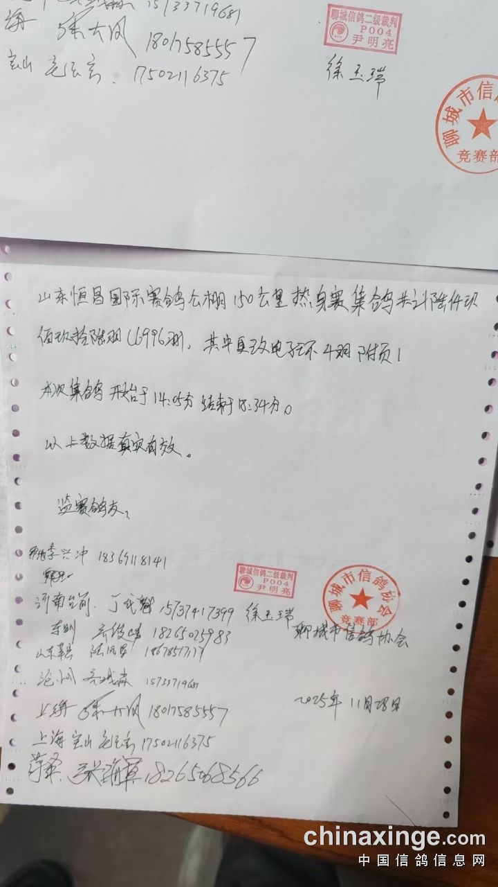 山东恒昌国际赛鸽中心350-400公里精英赛上笼清单