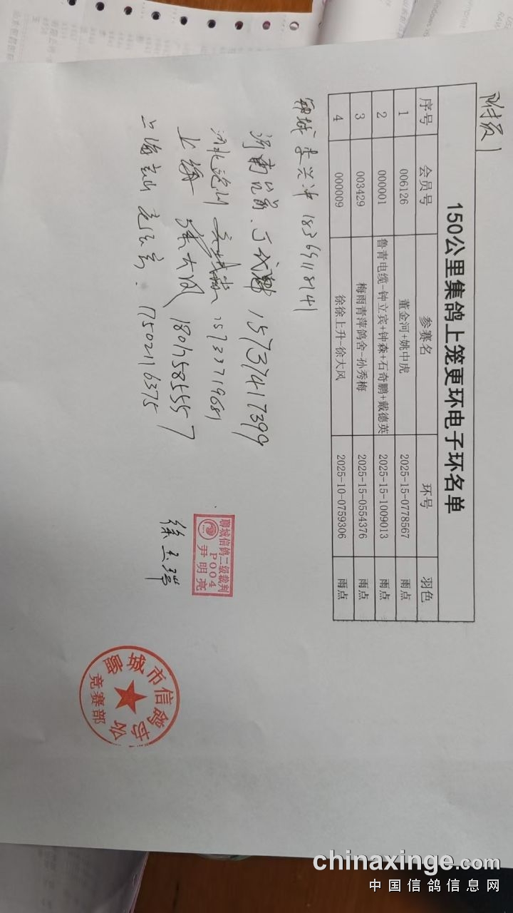 山东恒昌国际赛鸽中心150公里更换电子环清单