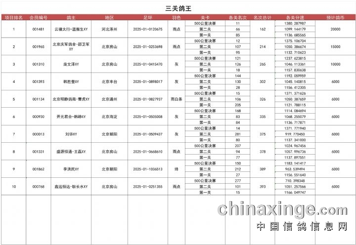 翔友国际赛鸽公棚第三关决赛1-600名剩余奖金均分名单