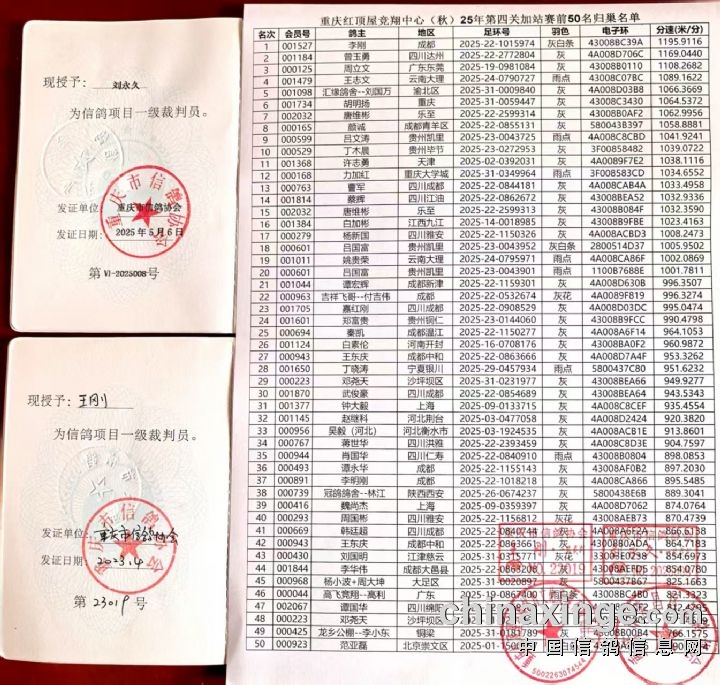 重庆红顶屋竞翔中心(秋)2025年第四关前50名归巢名单